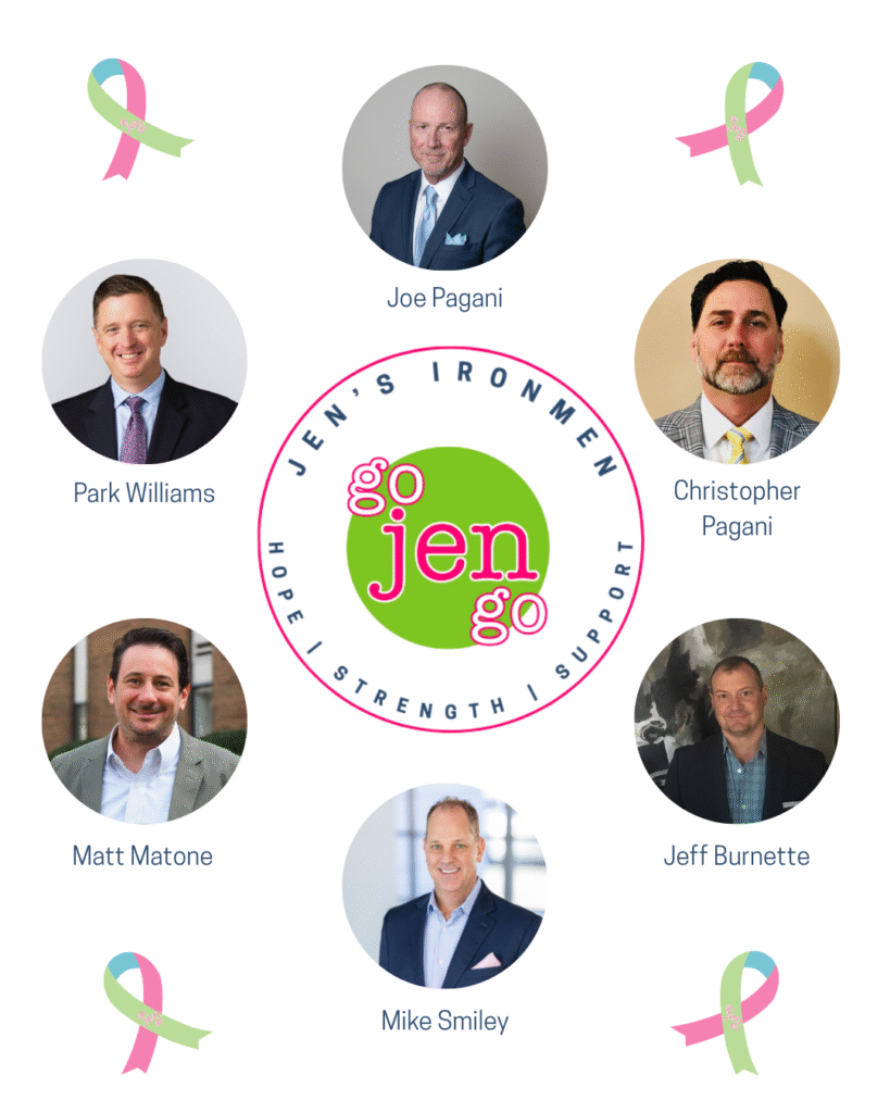 We are honored to introduce the inaugural class of Jen’s Ironmen — Joe Pagani, Jeff Burnette, Christopher Pagani, Matt Matone, Park Williams, and Mike Smiley. These amazing men stood by Jen throughout her 6 ½ years of treatment and continue to lift her legacy by providing hope and strength to the mission of Go Jen Go. We are forever grateful for their steadfast support, which has helped the foundation thrive and grow in service of local breast cancer patients and their families.