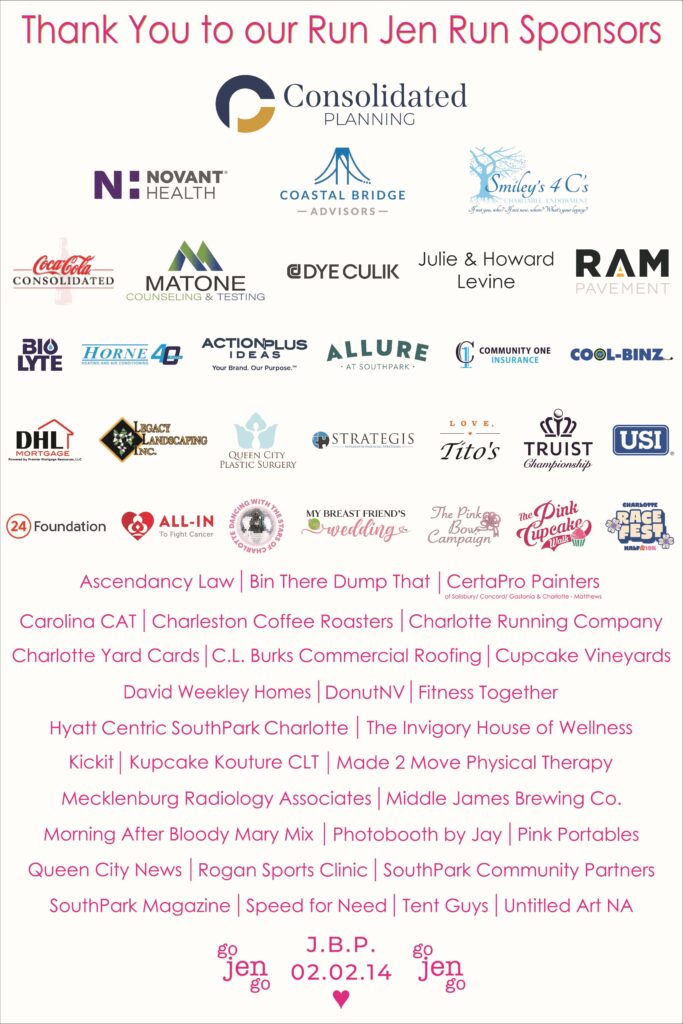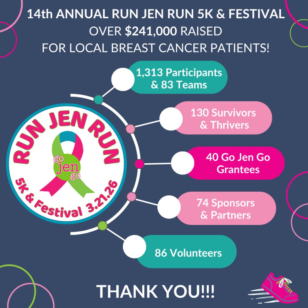The 14th Annual Run Jen Run 5K & Festival was a morning full of joy, celebration, and support for our local breast cancer community. We are grateful for the amazing sponsors, partners, donors, runners, walkers, ambassadors, and volunteers that helped make this year’s race such a success.